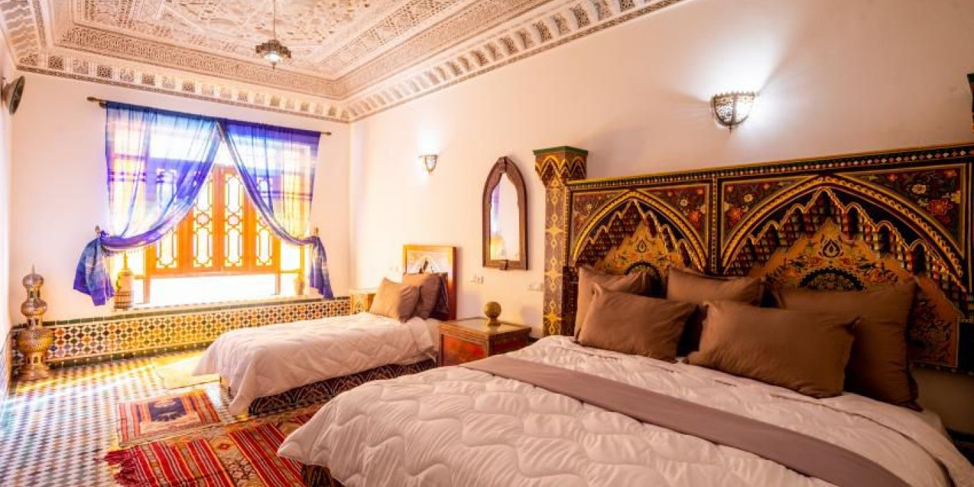 Ahí, en primera línea de duna, encontrarás varias propuestas de la máxima categoría. Suelen ser hoteles que mezclan el concepto de kasbah y de riad. Es decir, por un lado una arquitectura que recuerda a las antiguas fortalezas del desierto, como las que habrás visto de camino hasta llegar aquí, en el valle del Dades o del Draa. Y por otro lado, un espacio interior que recuerda a los edificios tradicionales de las medinas, que se articulan en torno a un patio central donde no puede faltar una refrescante fuente de agua y una vegetación que aporta un toque colorido y aromatizado al ambiente. Además, el interiorismo está también cuidado con mucho esmero, mezclando estilos bereberes y saharauis en el conjunto.